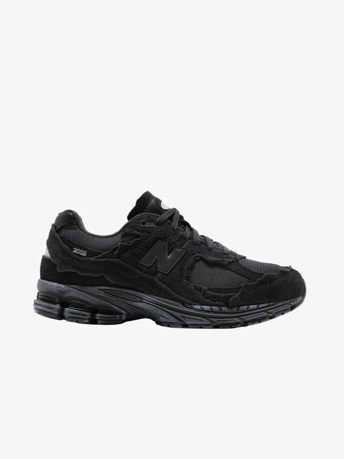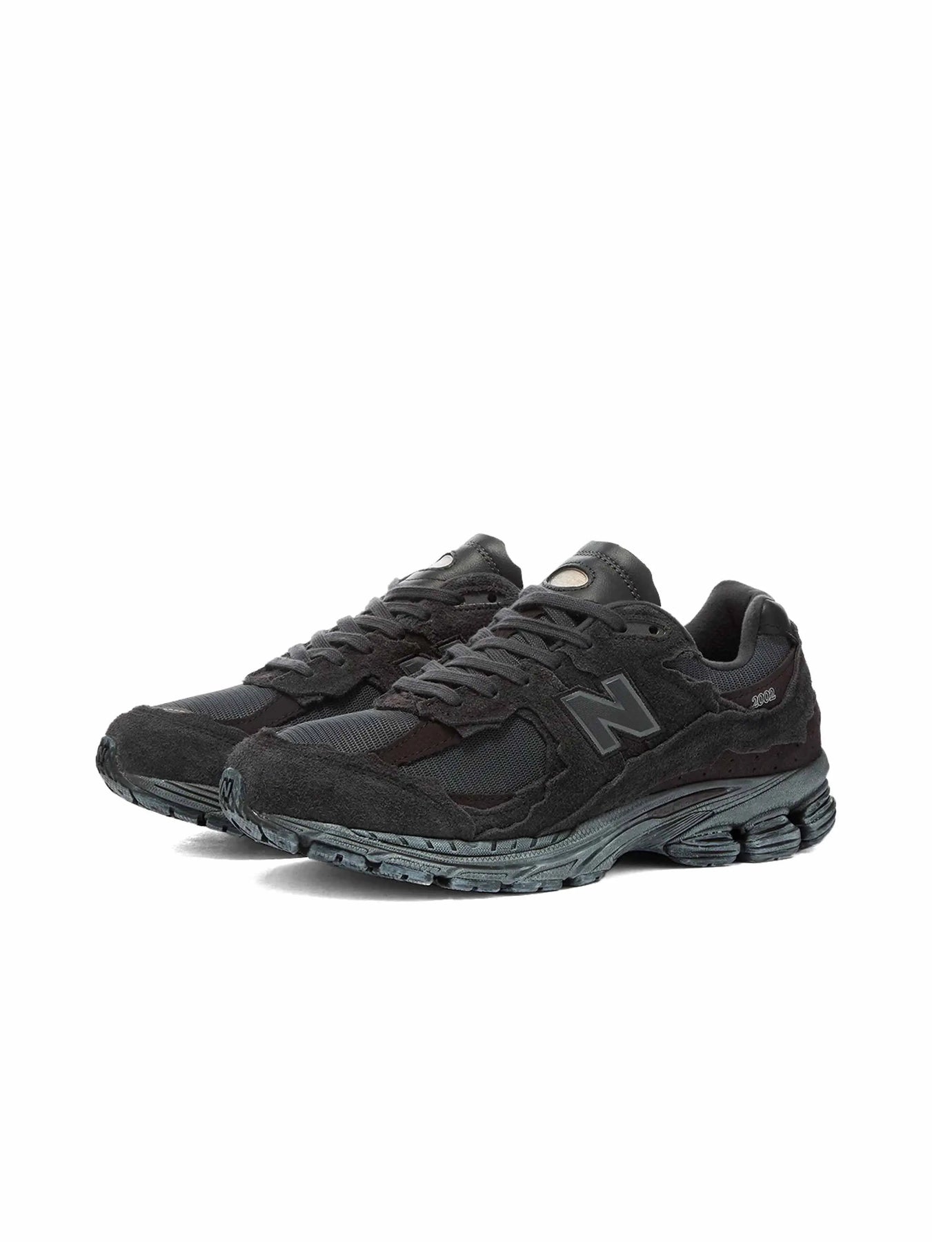 The New Balance 2002R Protection Pack Phantom features a charcoal mesh upper with monotone jagged suede overlays and unfinished edges. From there, a black Nrgy midsole and matching outsole add the finishing touches.