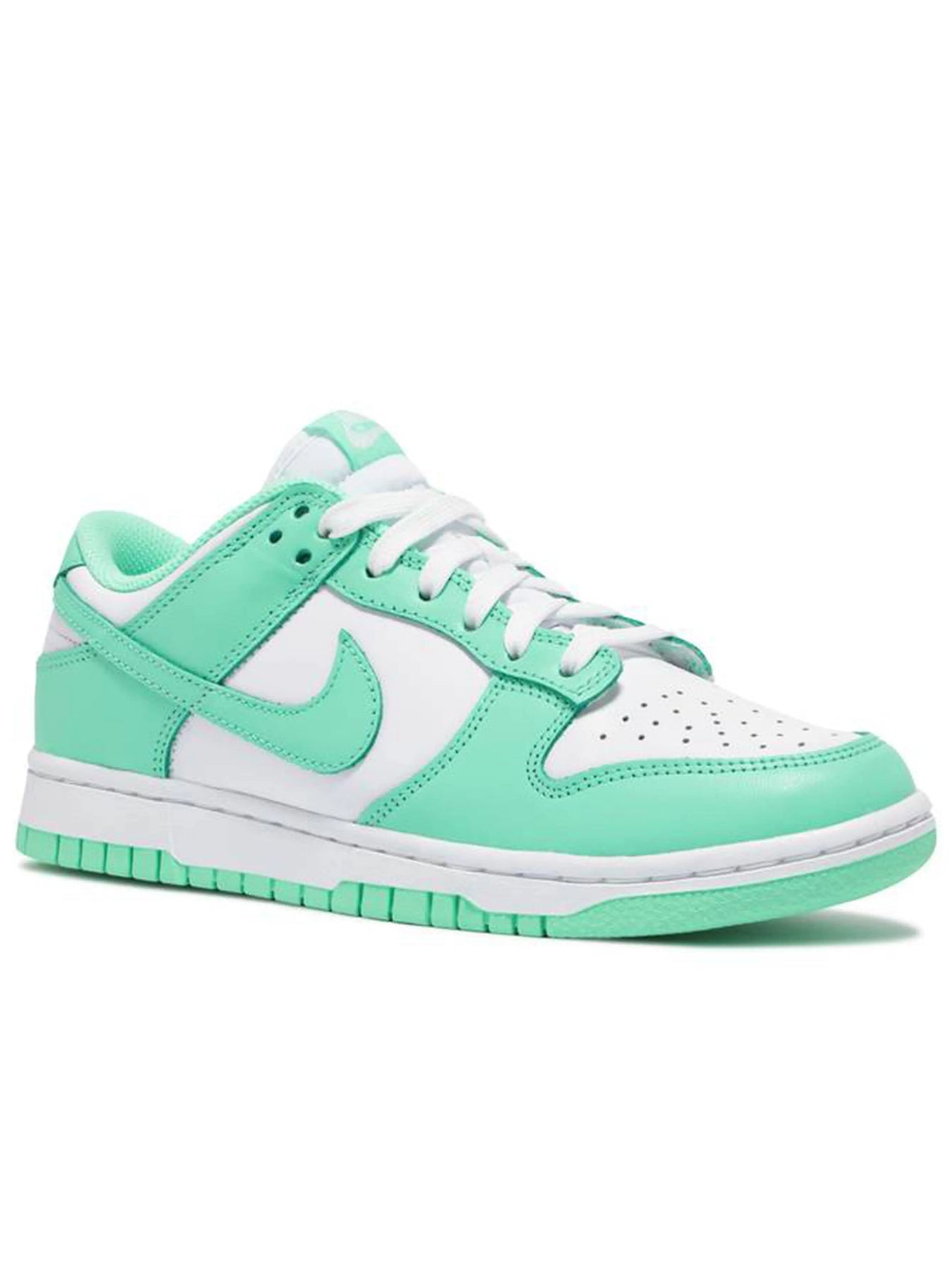 The Wmns Dunk Low 'Green Glow' emerges with a vibrant look on its classically color-blocked design. The shoe's upper features entirely leather construction finished with a white base that's highlighted by the overlays, which appear in Green Glow. More Green Glow marks the Swoosh branding, matched by the woven tongue tag. Perforations on the toe box are included for breathability, while underfoot, both colors come together on the rubber cup sole.