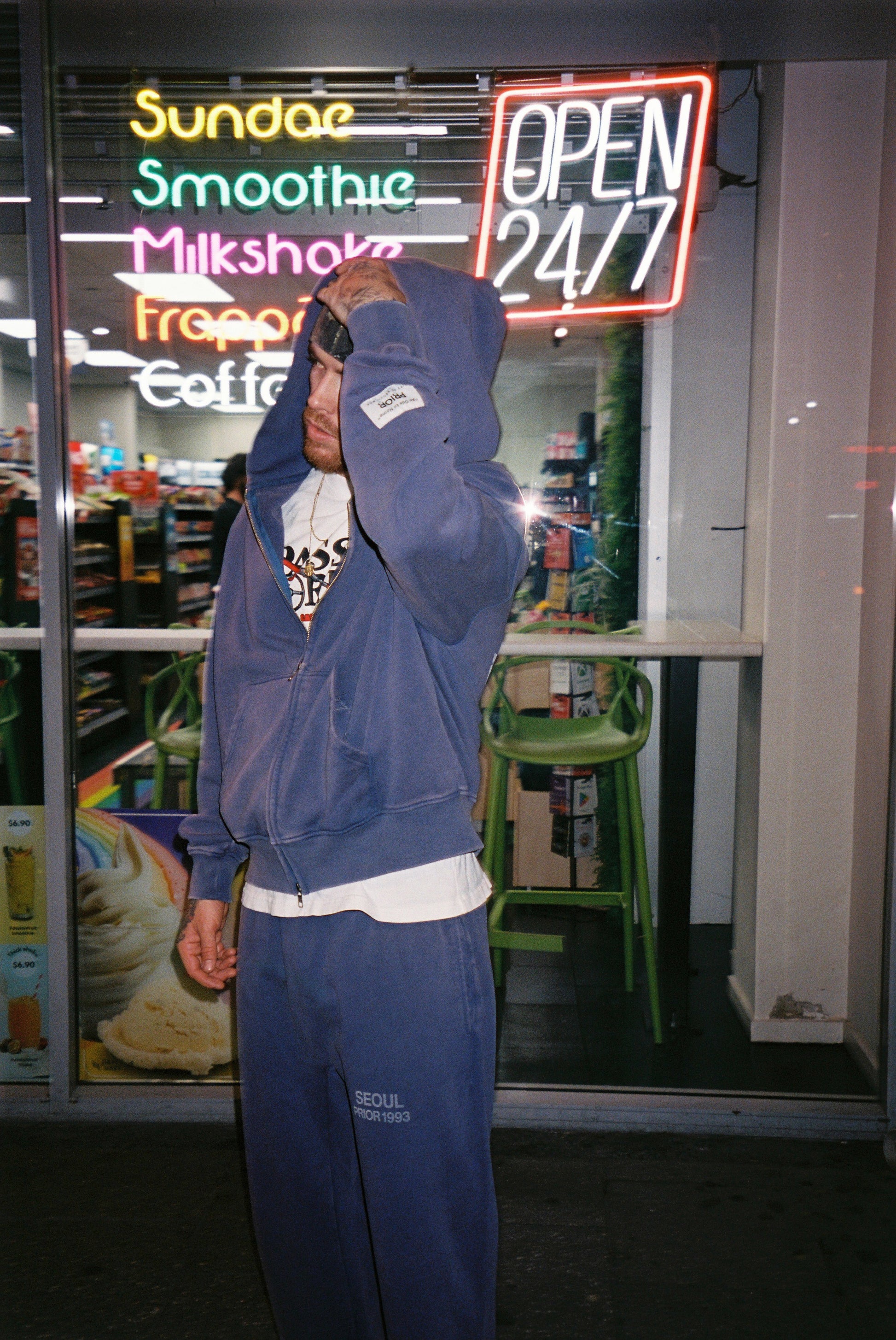 A considered take on elevated everyday wear. Crafted from heavyweight 440GSM cotton, this hoodie has been washed for a lived-in vintage look and feel. The double YKK zip construction allows versatile layering, balanced by a structured waistband that can be worn cropped or relaxed. Finished with our distressed “Seoul Prior 1993” logo and signature branded sleeve tag-our ode to home.