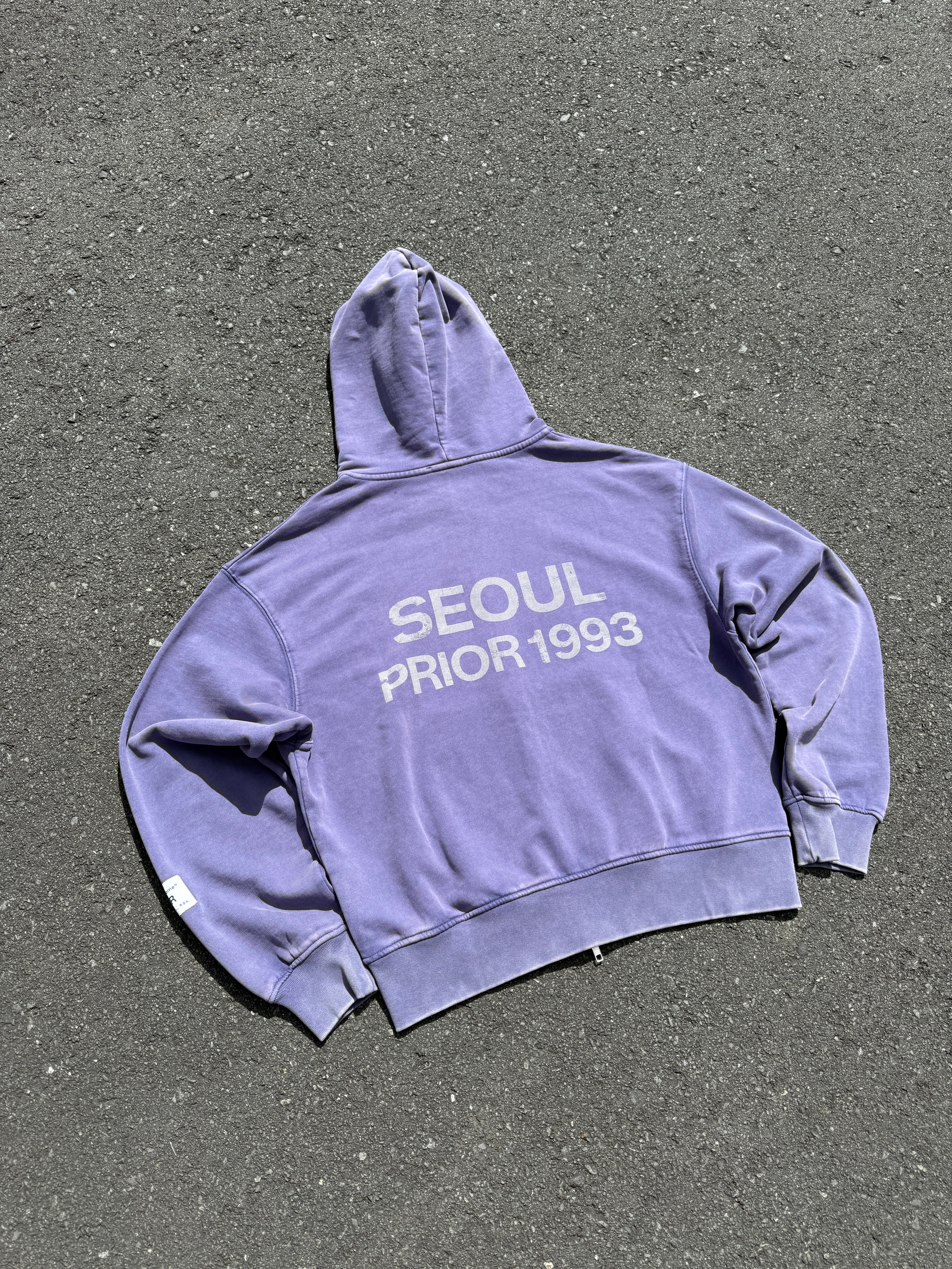 A considered take on elevated everyday wear. Crafted from heavyweight 440GSM cotton, this hoodie has been washed for a lived-in vintage look and feel. The double YKK zip construction allows versatile layering, balanced by a structured waistband that can be worn cropped or relaxed. Finished with our distressed “Seoul Prior 1993” logo and signature branded sleeve tag-our ode to home.