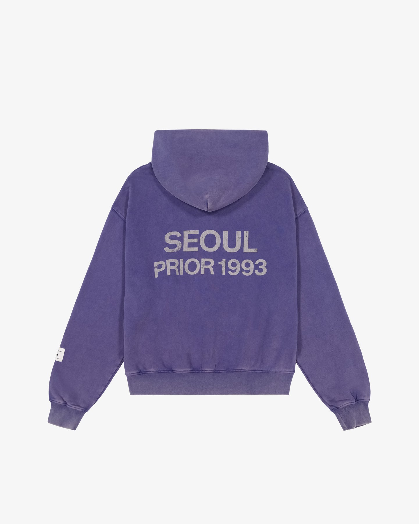 A considered take on elevated everyday wear. Crafted from heavyweight 440GSM cotton, this hoodie has been washed for a lived-in vintage look and feel. The double YKK zip construction allows versatile layering, balanced by a structured waistband that can be worn cropped or relaxed. Finished with our distressed “Seoul Prior 1993” logo and signature branded sleeve tag-our ode to home.
